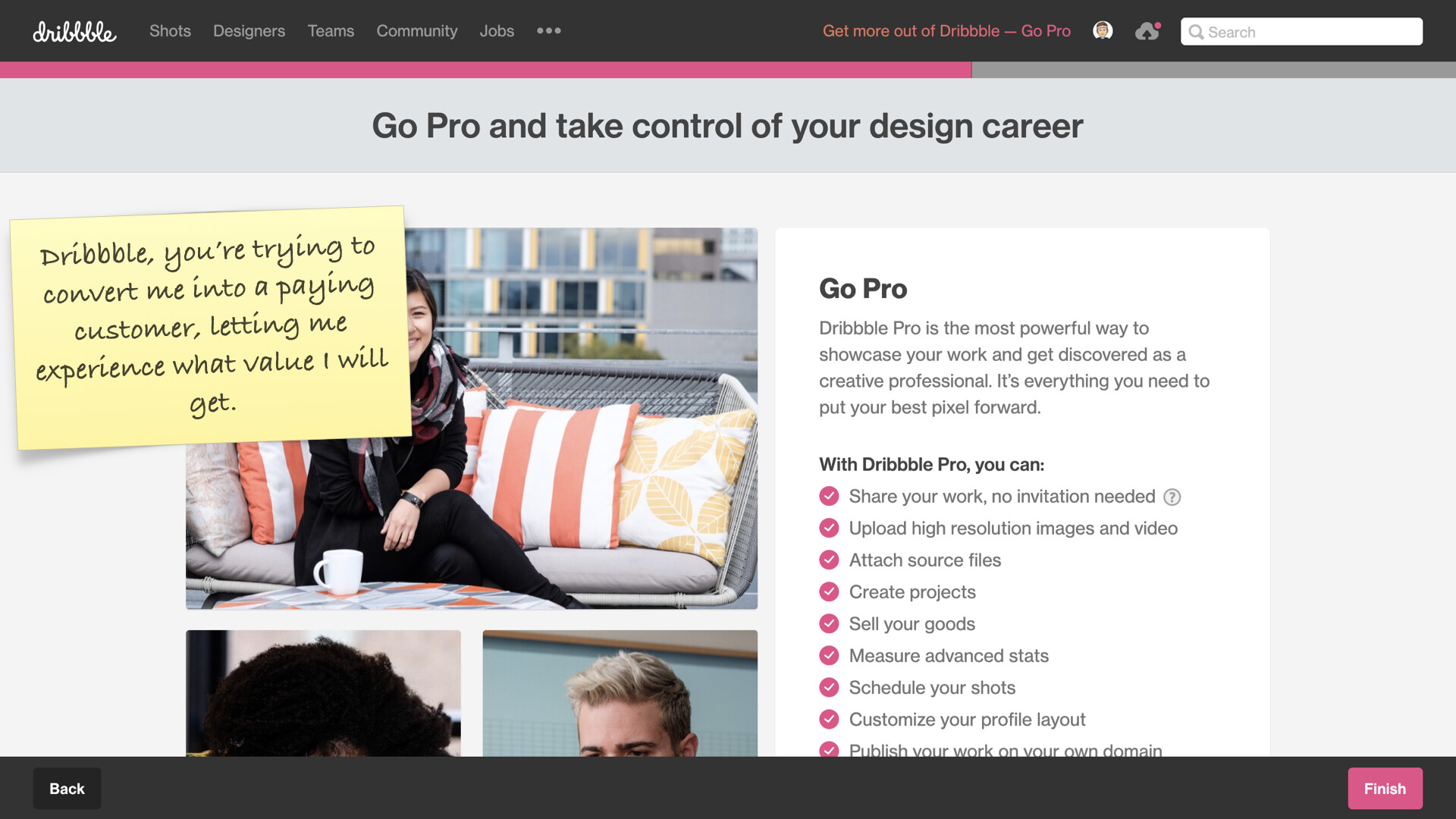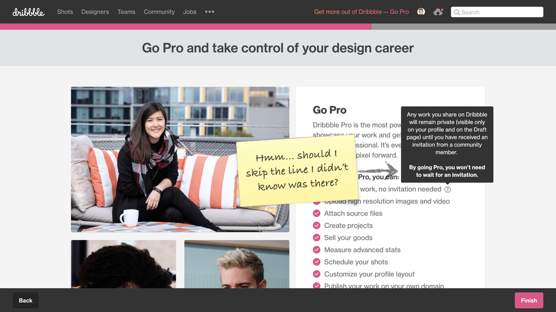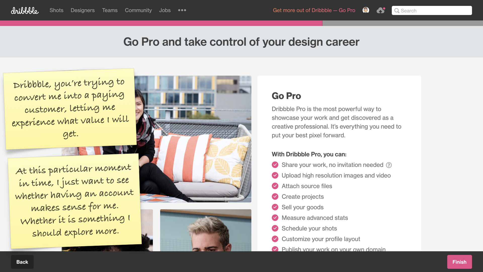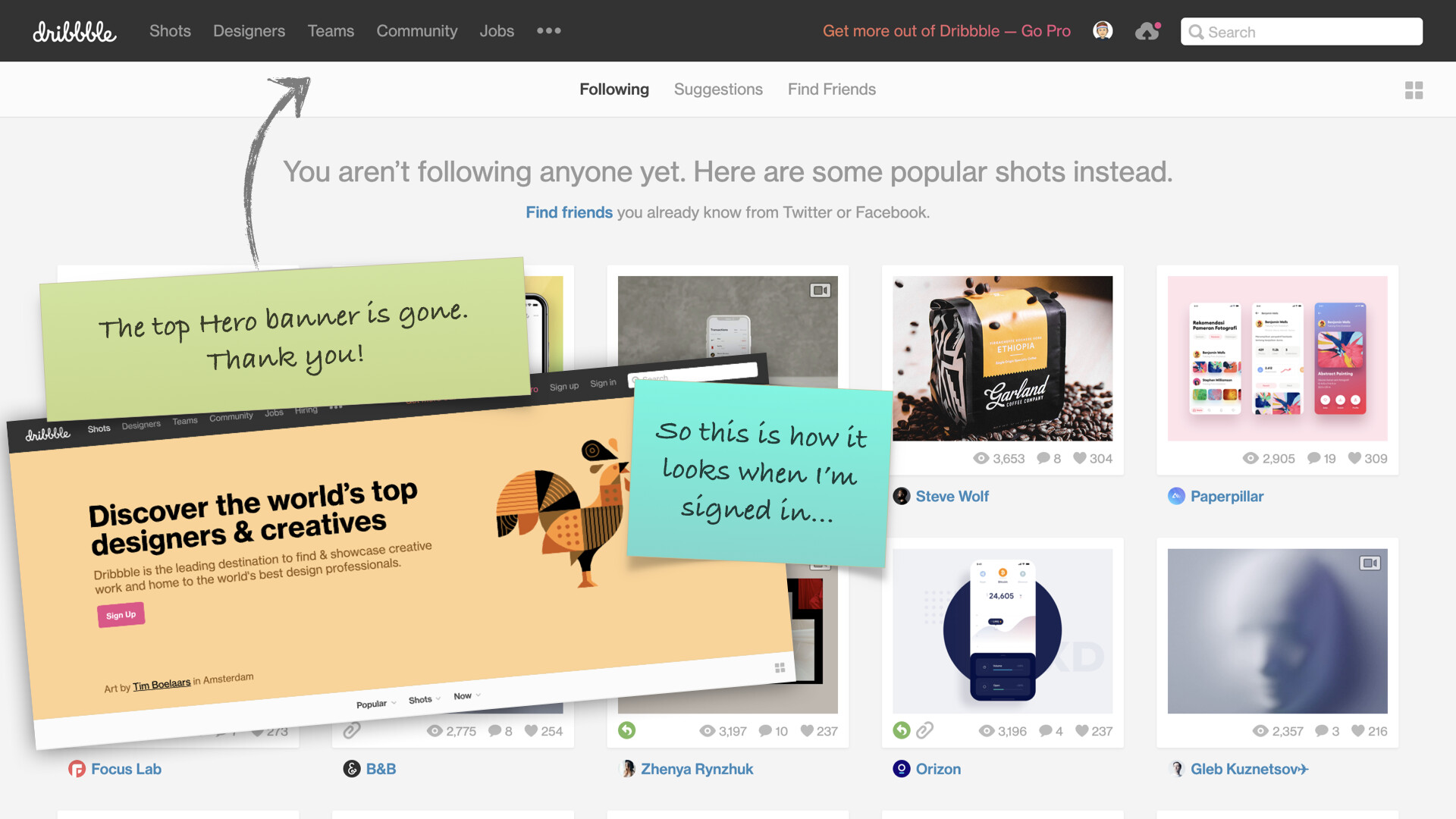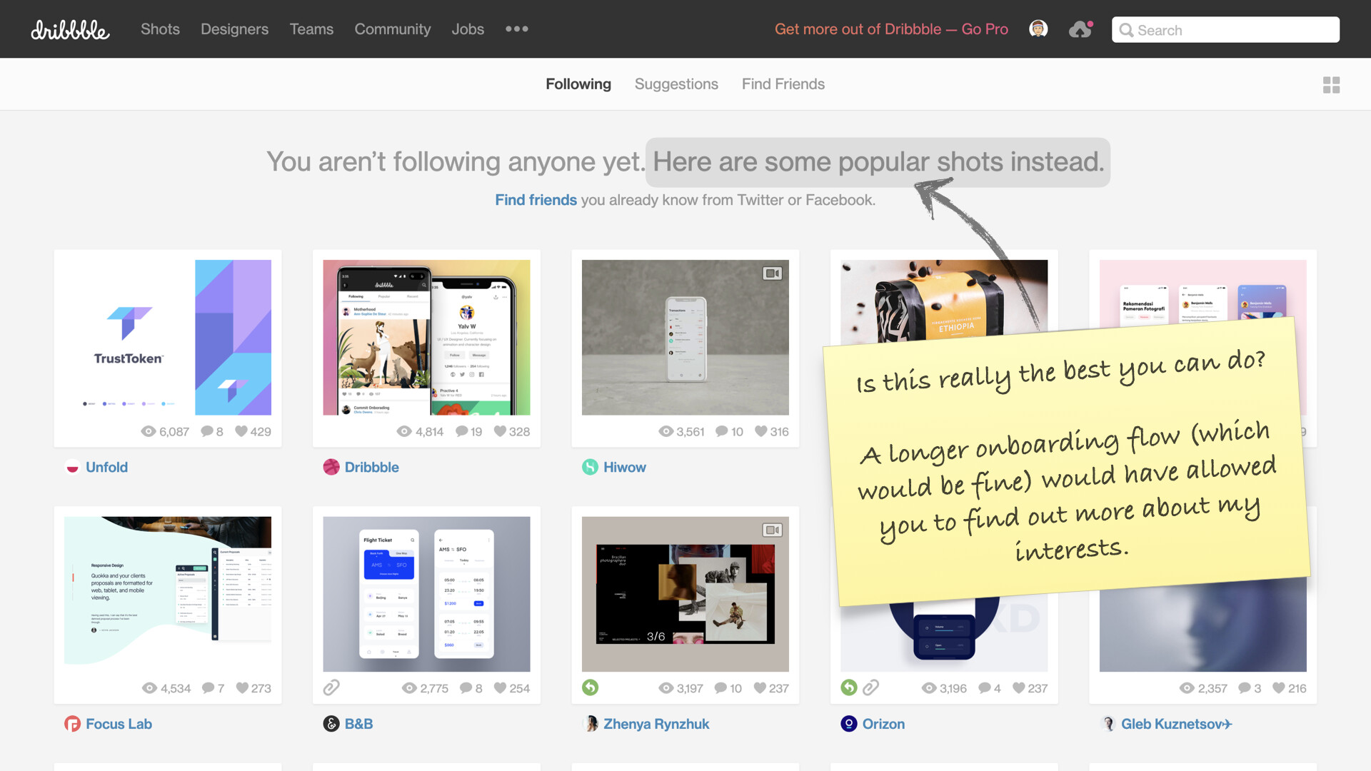 Dribbble is known as one of the leading visual design communities for design peers to share their best and most stunning work. But how well has a design community site designed its own UX flows?
