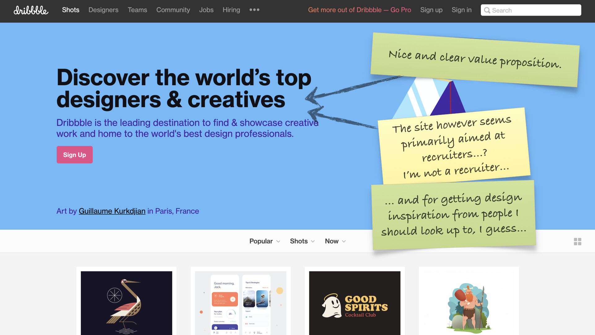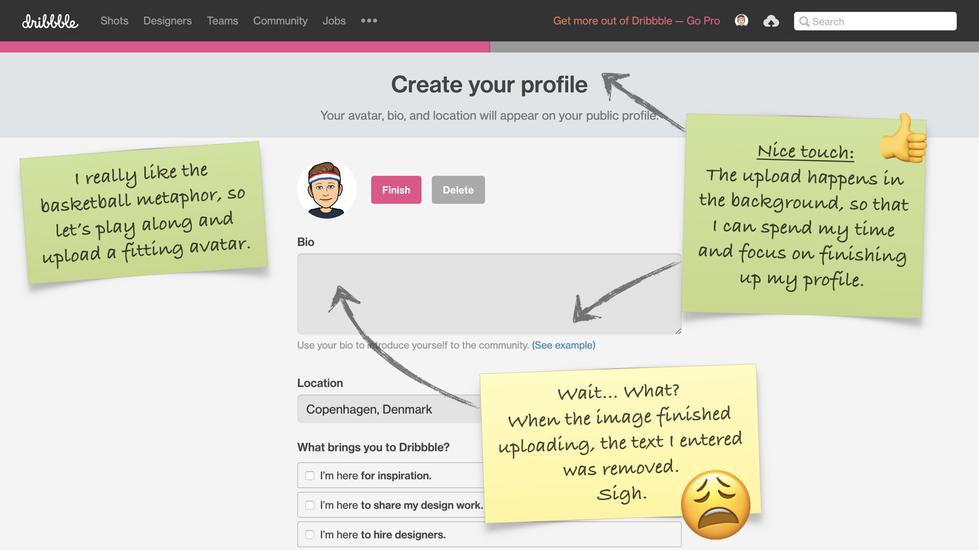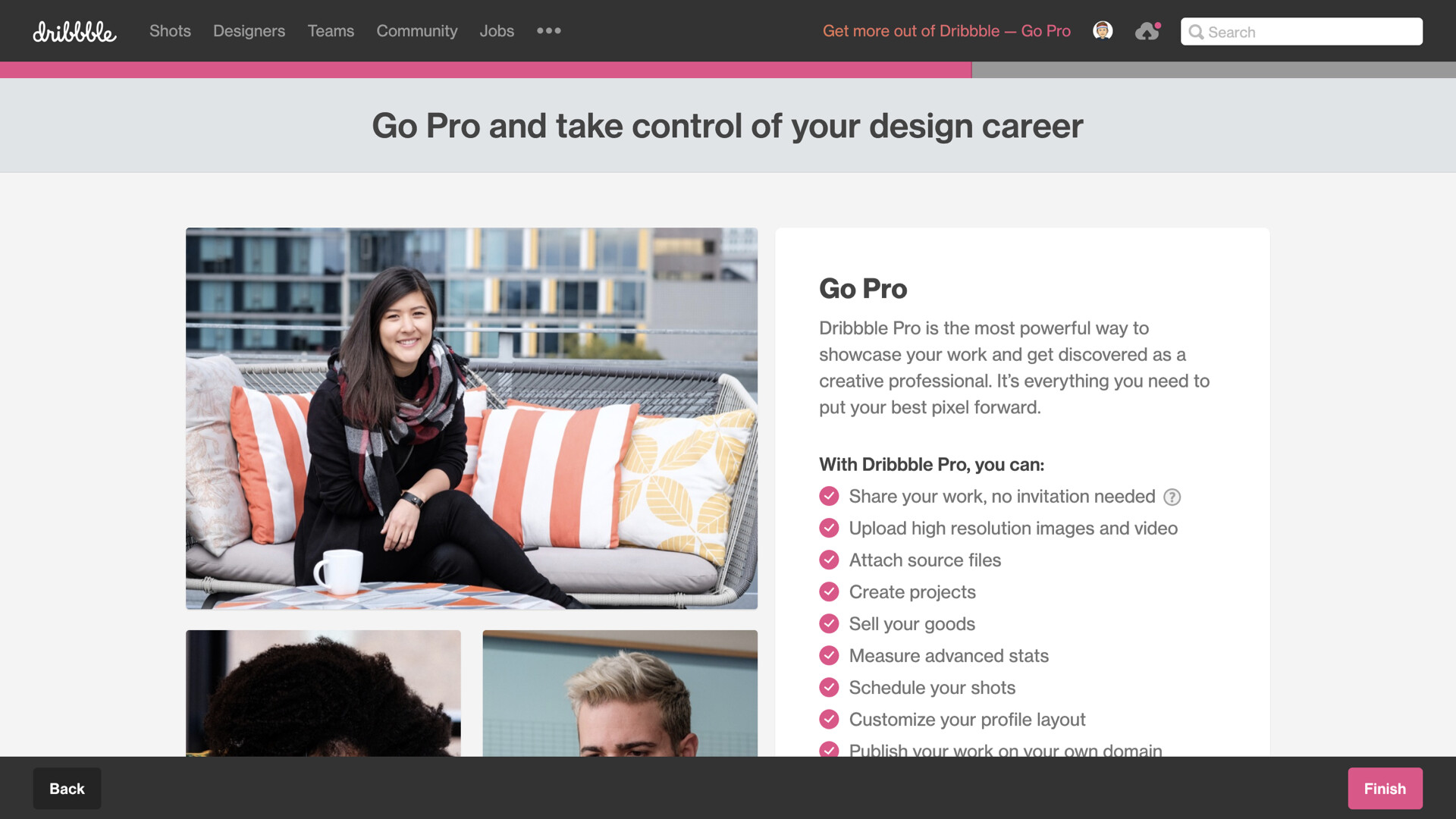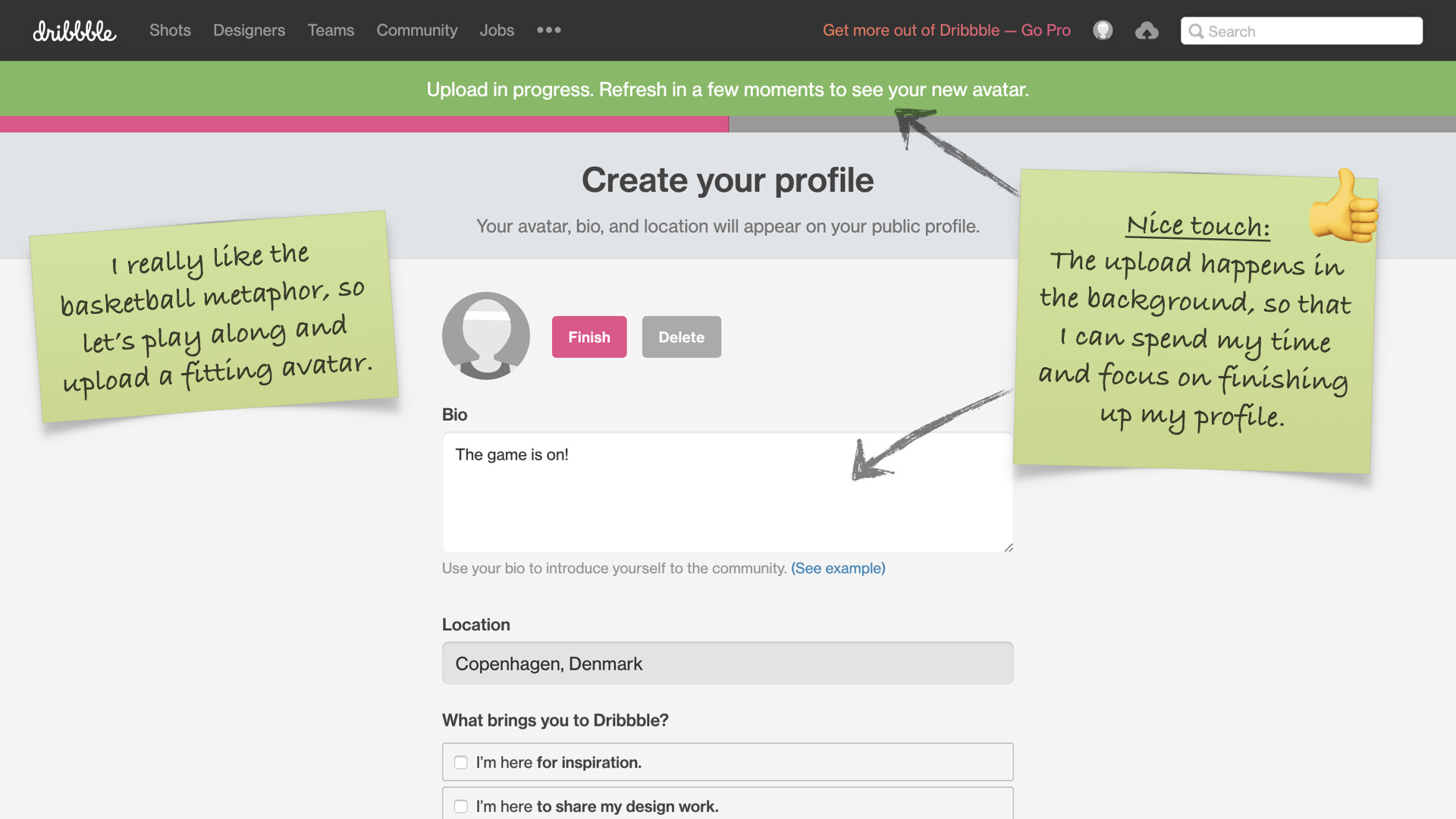 Dribbble is known as one of the leading visual design communities for design peers to share their best and most stunning work. But how well has a design community site designed its own UX flows?