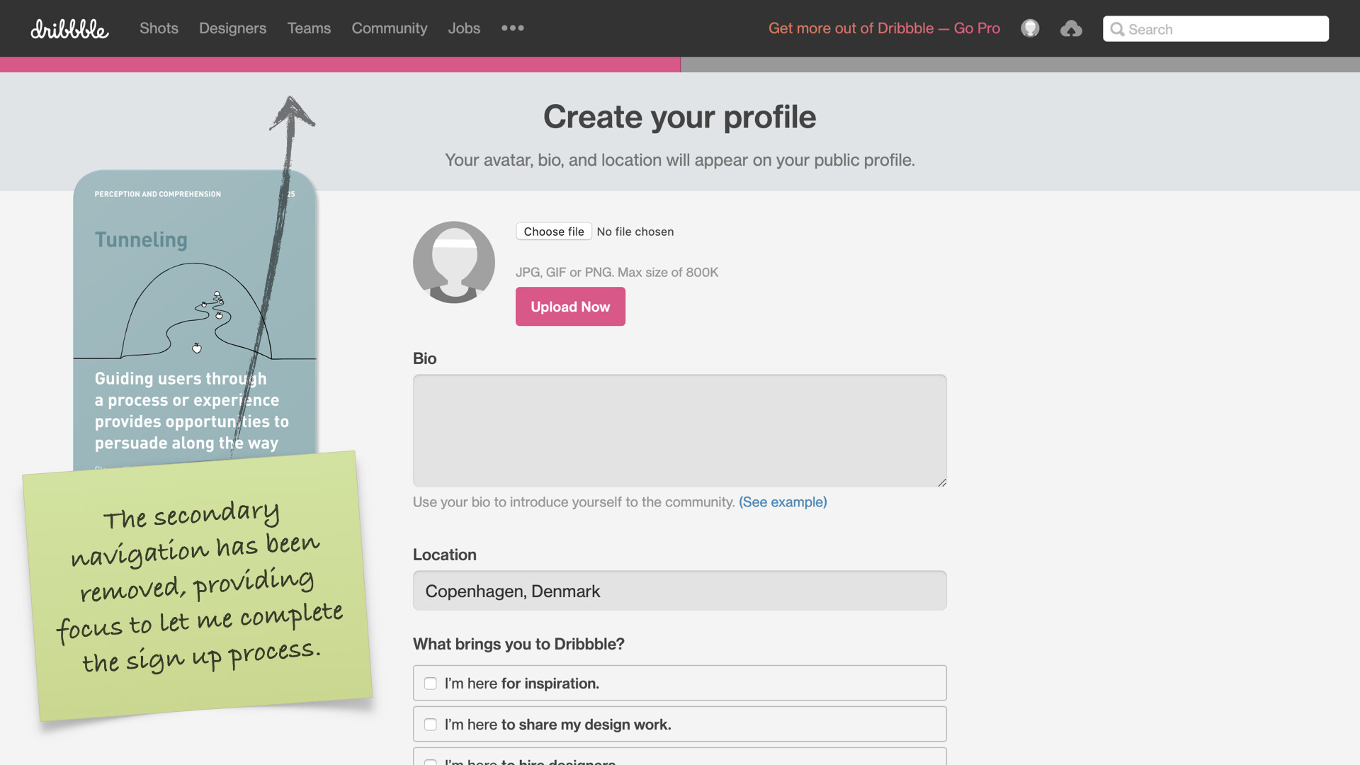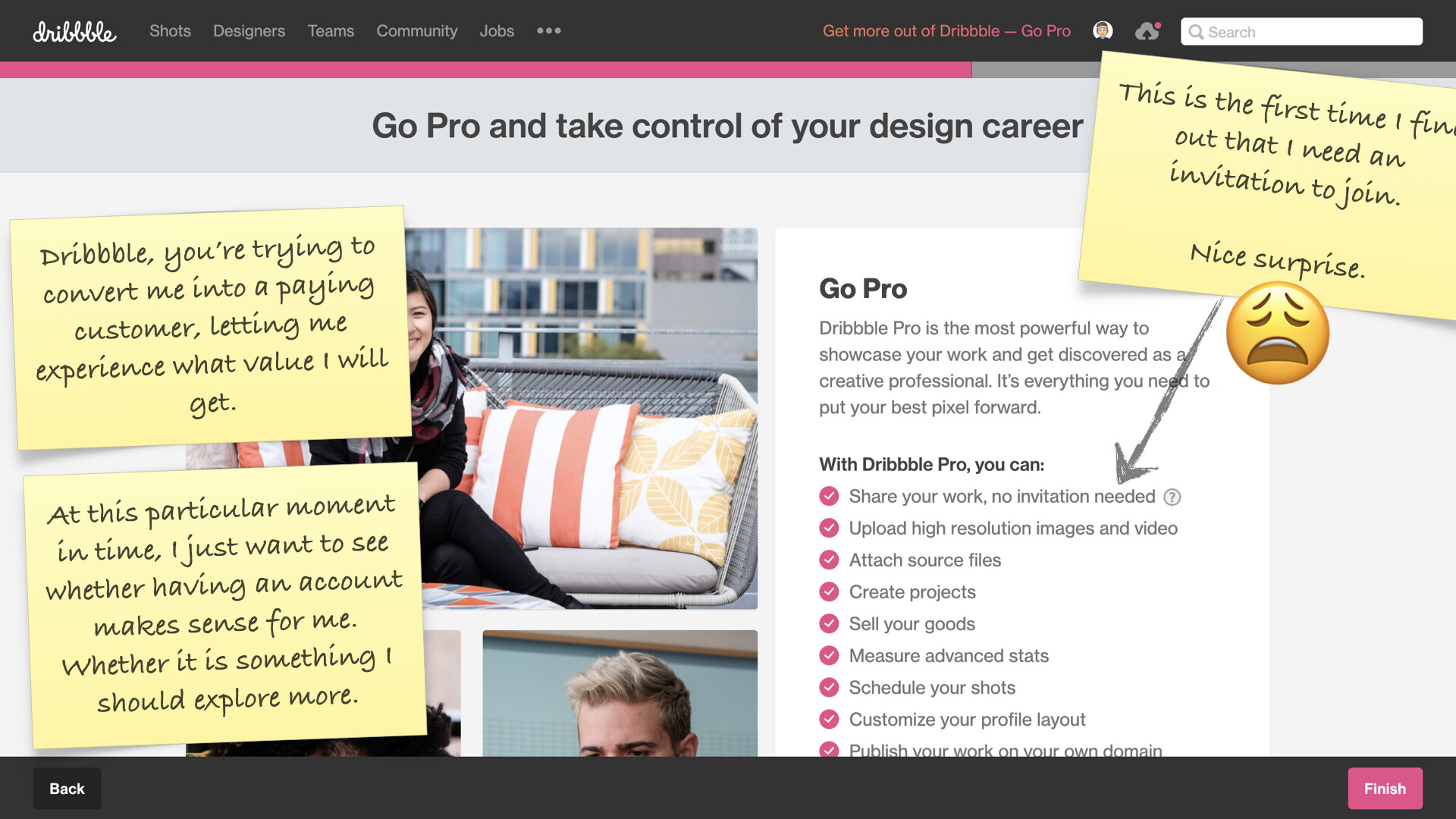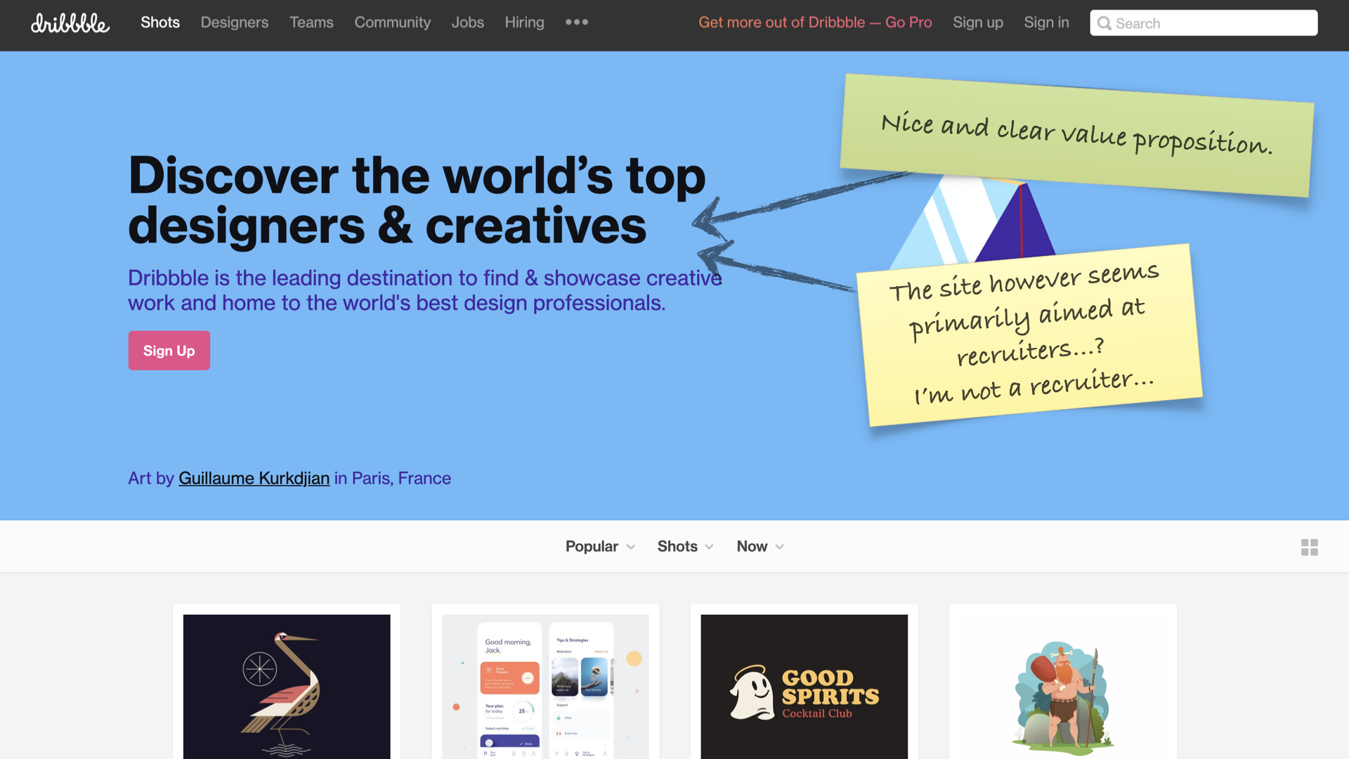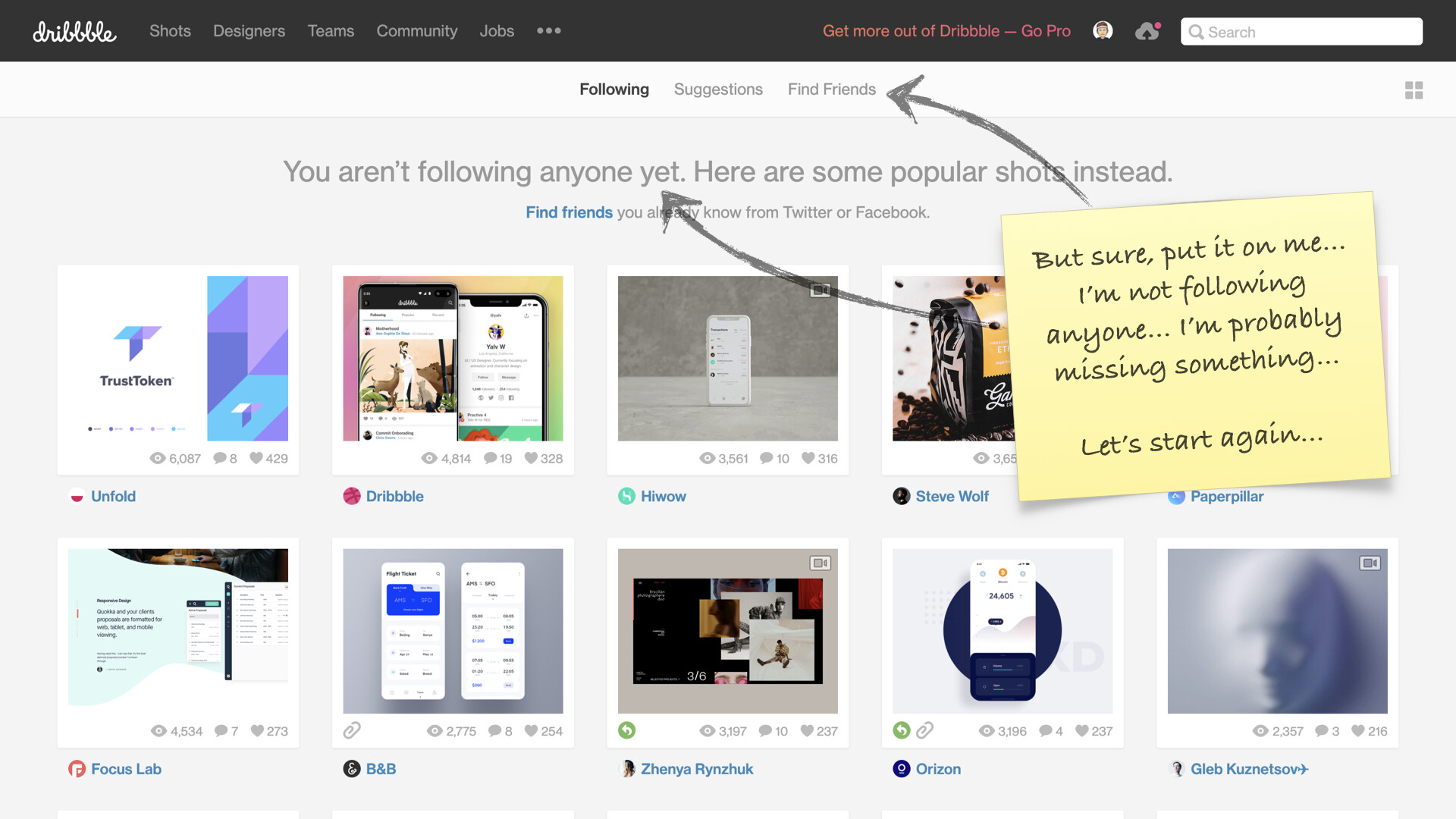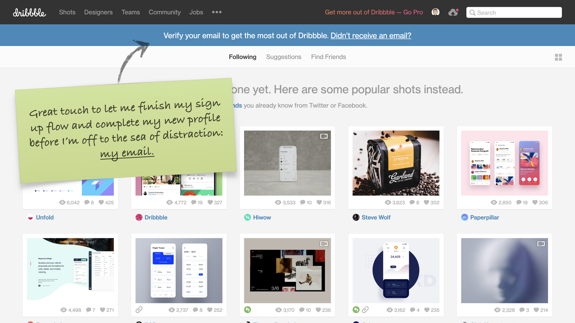 Dribbble is known as one of the leading visual design communities for design peers to share their best and most stunning work. But how well has a design community site designed its own UX flows?